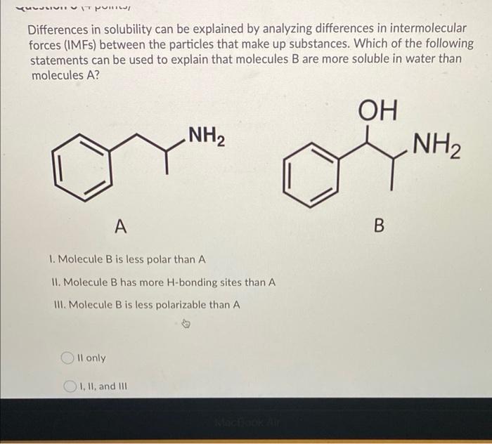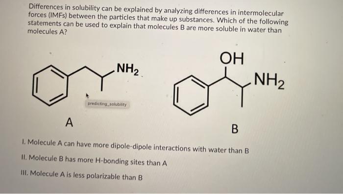 Which of the following statements can be used to explain that molecules B are more soluble in water than molecules A. In London dispersion the intermolecular attraction. IMFs are much much weaker than chemical bonds - about 10 weaker.